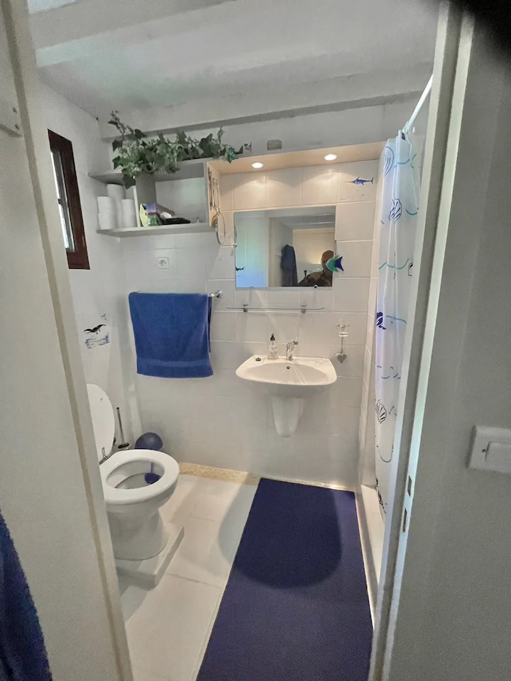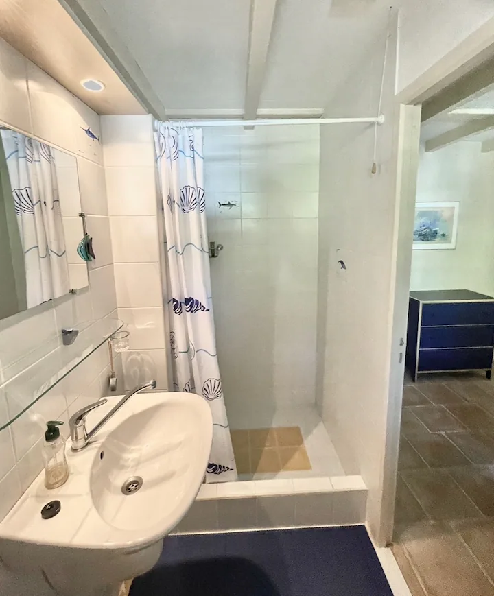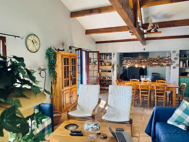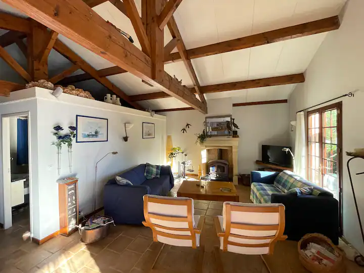 Van binnen biedt onze volledig uitgeruste keuken en comfortabele woonkamer met open haard alle gemakken van thuis. Trek je terug in een van onze drie slaapkamers, met twee tweepersoonsbedden en drie eenpersoonsbedden, waar plaats is voor maximaal zeven gasten.